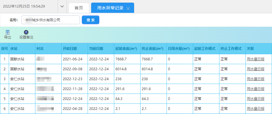 通過大數(shù)據(jù)分析技術(shù),判斷各村用水是否存在異常情況(例如:不欠費(fèi),多日用水量為0;欠費(fèi)關(guān)閥后,仍有用水量等),出現(xiàn)異常,立即報(bào)警提示。